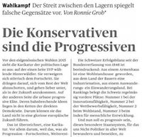 Vor den Wahlen 2015 sieht die Karikatur der politischen Lage so aus: Auf der einen Seite die SVP wählenden Hinterwäldler, die sich störrisch jedem Fortschritt verweigern, darauf drängen, sich vom Rest der Welt abzuschotten und lieber untergehen, als in der Zukunft anzukommen. Auf der anderen Seite die urbane, progressive Elite, deren bahnbrechende Ideen in den Ketten der Direkten Demokratie liegen und die deshalb das Land nicht in eine gloriose internationale oder wenigstens europäische Zukunft führen können. Es ist deshalb eine Karikatur, weil das, was als Progression (Fortschreiten, Weiterentwicklung) verkauft wird, eine Regression (Rückgang, Zurückfallen) wäre. Jene besonderen Errungenschaften, die sich die Schweiz im 19. Jahrhundert in die Verfassung geschrieben hat, machen den Schweizer Staat bis heute zum fortschrittlichsten Staatswesen weit und breit.